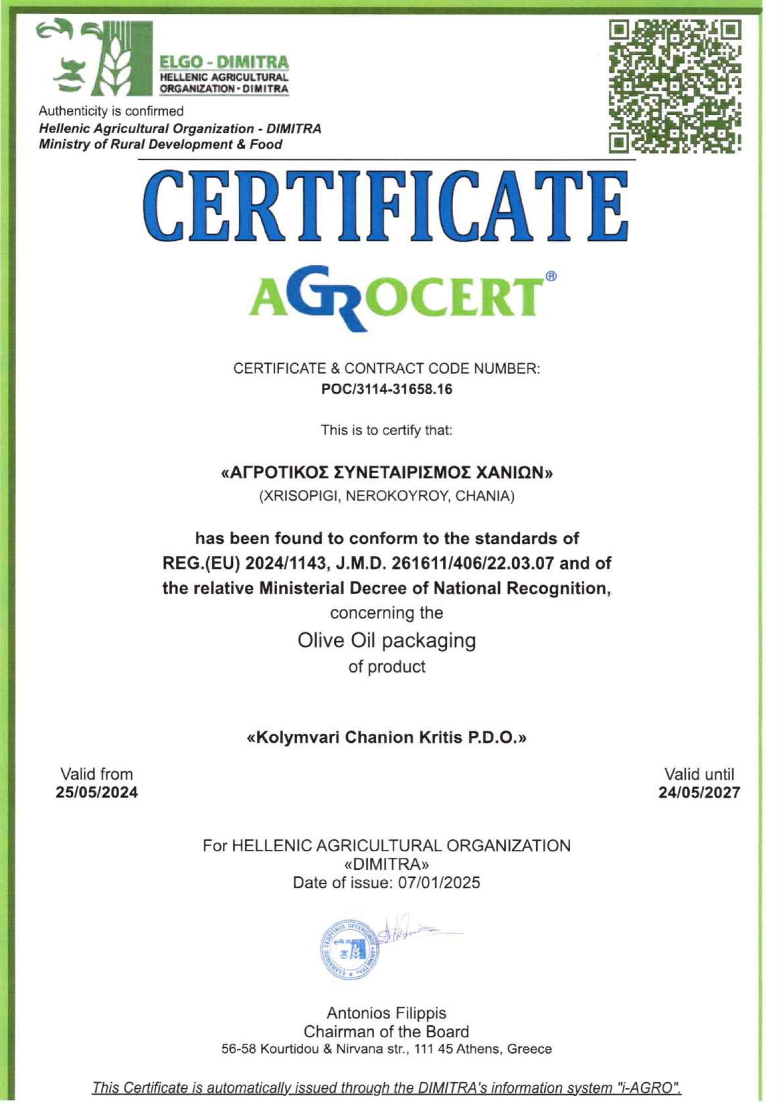 Die Zertifizierung durch das griechische Landwirtschaftsministerium unterstreicht zusätzlich die geprüfte Herkunft und Qualität des Olivenöls.